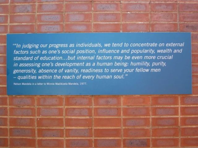 My cousin, Chinue, recently returned from South Africa. She’d been before, but this was her first trip back in 10 years. Given her enthusiasm for the country, I’m convinced she secretly wants to live there (or at least have a vacation spot). While pictures from her trip included the obligatory sunrise-on-the-beach shots they also included the above. This is a picture Chinue took while visiting Mandela’s home. The plaque features an excerpt from a letter Mandela sent to his wife while he was in prison: